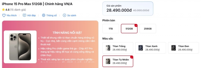 Cuối tháng 1, giá đập hộp iPhone 15 Pro Max đang ở mức 28.49 triệu đồng cho mẫu 512GB, tăng lên 31.99 triệu đồng cho mẫu 1TB, vẫn rẻ hơn iPhone 17 Pro Max gần 20 triệu đồng.