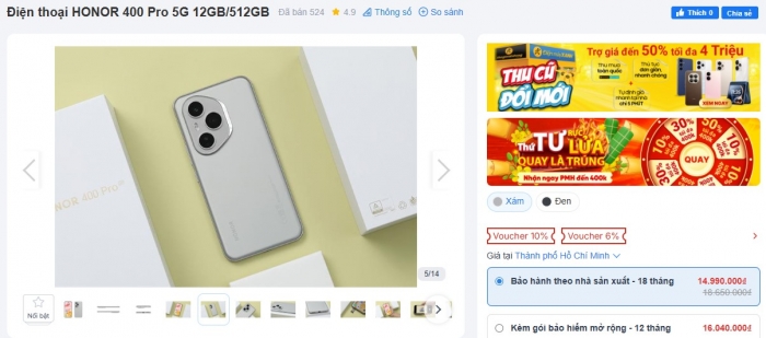 Tại thời điểm đầu tháng 2, HONOR 400 Pro đang được phân phối chính hãng với giá chỉ 14.99 triệu đồng cho cấu hình 12GB/512GB, rẻ chưa bằng nửa so với đối thủ Galaxy S25 Ultra.
