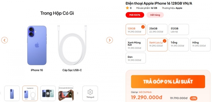 Bước sang tháng 2/2026, giá đập hộp iPhone 16 rẻ nhất chỉ từ 19.29 triệu đồng cho bộ nhớ 128GB và 22.39 triệu đồng cho bản 256GB, còn mẫu 512GB đang khá hiếm trên thị trường. Với giá bán này, iPhone 16 đang rẻ hơn iPhone 17 từ 5 8 triệu đồng.