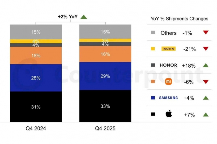 Đáng chú ý, khoảng cách thị phần giữa Apple và Samsung tiếp tục được mở rộng. Nếu như quý 4/2024, Apple chỉ nhỉnh hơn 3%, thì đến cùng kỳ năm 2025, con số này đã tăng lên 4%. Samsung vẫn giữ vị trí thứ hai và ghi nhận mức cải thiện nhẹ cả về doanh số lẫn thị phần, song chưa đủ để thu hẹp khoảng cách với đối thủ.
