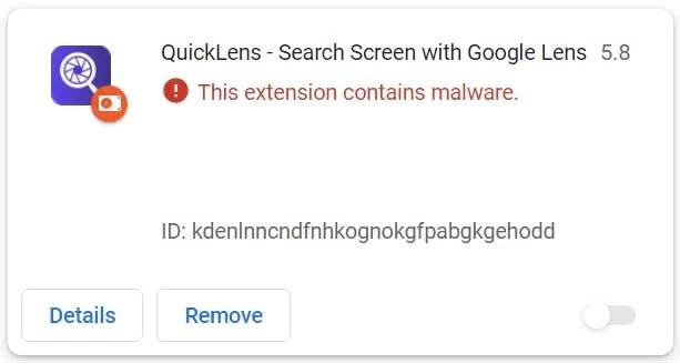 Theo trang bảo mật Bleeping Computer, tiện ích QuickLens, vốn cho phép tìm kiếm hình ảnh trực tiếp bằng Google Lens đã bị chèn mã độc sau khi chuyển quyền sở hữu. Trước thời điểm này, QuickLens hoạt động bình thường và có khoảng 7.000 lượt cài đặt.