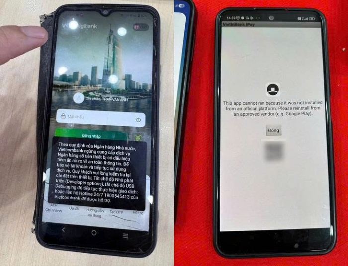 Trường hợp thứ ba liên quan đến ứng dụng ngân hàng bị can thiệp, như cài đặt từ file APK bên ngoài thay vì tải trực tiếp từ App Store hoặc Google Play, hoặc bị chèn mã lạ để theo dõi thao tác của người dùng.