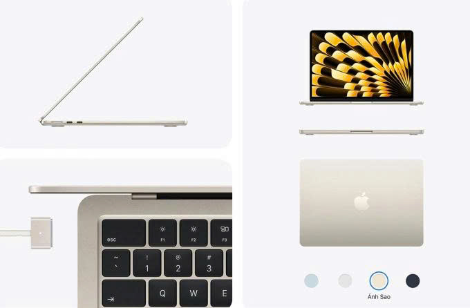 Về ngoại hình, MacBook Air M5 không thay đổi đáng kể. Máy tiếp tục có hai tùy chọn màn hình 13,6 inch và 15,3 inch, độ sáng tối đa 500 nits, hỗ trợ hiển thị một tỷ màu.