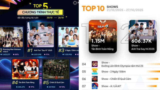 Theo thống kê từ Younet.Media, ba show có lượng thảo luận cao nhất lần lượt là Tân Binh Toàn Năng, Anh Trai Say Hi 2025 và Running Man Việt Nam mùa 3. Trong khi đó, dữ liệu từ Kompa lại cho kết quả hoàn toàn khác: Anh Trai Say Hi 2025 dẫn đầu với 4.521.598 lượt thảo luận, Running Man Việt Nam mùa 3 xếp thứ hai với 1.133.936 lượt, còn Tân Binh Toàn Năng chỉ đứng thứ tư với 305.275 lượt tương tác.