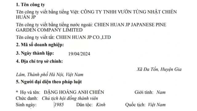 Theo thông tin ghi nhận, doanh nghiệp được Huấn Hoa Hồng "rót vốn" đầu tư khủng là Công ty TNHH Vườn Tùng Nhật Chiến Huấn JP (trụ sở tại xã Gia Lâm, TP Hà Nội) được thành lập vào tháng 4/2024 do ông Đặng Hoàng Anh Chiến (sinh năm 1985) giữ vai trò đại diện pháp luật kiêm Chủ tịch Hội đồng thành viên.