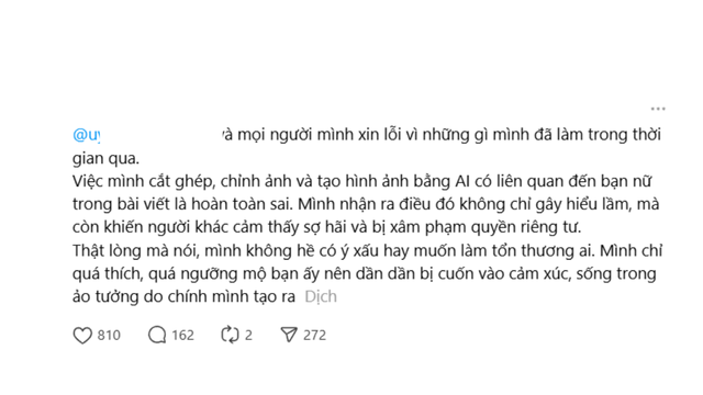 "Việc mình cắt ghép, chỉnh ảnh và tạo hình ảnh bằng AI có liên quan đến bạn nữ trong bài viết là hoàn toàn sai. Mình nhận ra điều đó không chỉ gây hiểu lầm, mà còn khiến người khác cảm thấy sợ hãi và bị xâm phạm quyền riêng tư.