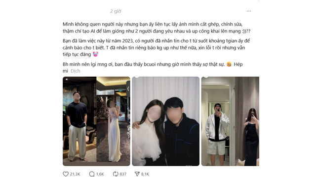 Bài đăng nhanh chóng trở nên viral trên Threads, thu hút sự chú ý của cư dân mạng. Trong bài viết, cô gái (tạm gọi là U.) cho biết bản thân liên tục bị một nam thanh niên lạ mặt tên L. sử dụng hình ảnh cá nhân, cắt ghép, chỉnh sửa, thậm chí sử dụng AI để ghép ảnh của người này với cô như thể hai người là một cặp đôi đang hẹn hò, sau đó đăng tải, khoe khoang khắp nơi trên mạng xã hội.