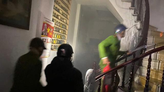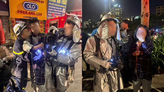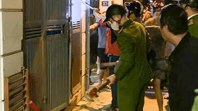 Lực lượng chức năng nhanh chóng di chuyển tới hiện trường, mang theo phương tiện, đồ bảo hộ, sau đó dùng búa đập cửa nhà dân, đưa 7 người đang mắc kẹt trong đám cháy thoát nạn ra ngoài.