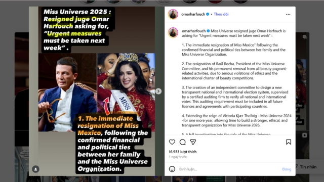 Ngày 23/11, trên trang cá nhân Instagram, ông Omar Harfouch - cựu ban giám khảo Miss Universe 2025 đã đăng tải bài viết liên quan đến kết quả cuộc thi năm nay. Trong đó, những thông tin của ông viết về tân hoa hậu Fátima Bosch (Mexico) gây nhiều chú ý.