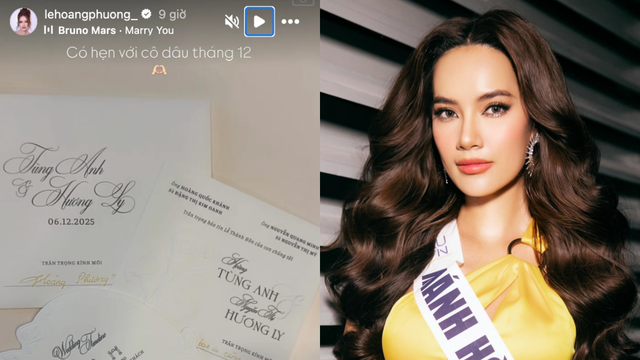 Mới đây, hoa hậu Lê Hoàng Phương bất ngờ đăng tải một story chụp ảnh chiếc thiệp cưới của á hậu Hương Ly với dòng trạng thái “Có hẹn với cô dâu tháng 12”.