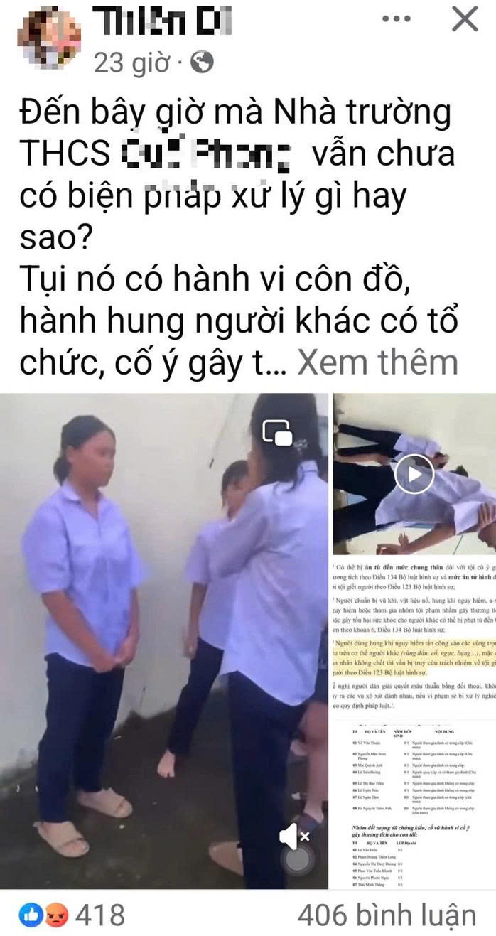 Sau khi xác nhận đoạn video trên, cơ quan chức năng xã Quế Sơn (TP Đà Nẵng) đã vào cuộc điều tra. Nạn nhân được xác định là em H.G.H., học sinh lớp 8/1, Trường THCS Q.P.