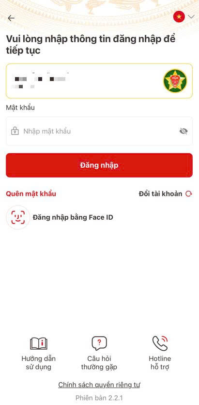 Đăng nhập ứng dụng VNeID bằng tài khoản định danh điện tử mức độ 2.