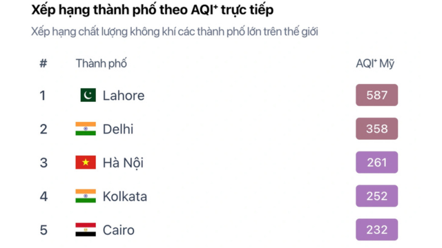 Theo ghi nhận từ hệ thống quan trắc của Cục Môi trường (Bộ Nông nghiệp và Môi trường), chỉ số AQI của Hà Nội vào chiều 12/12 đạt 261 – mức tím, đứng thứ 3 thế giới trong danh sách các thành phố ô nhiễm nhất, chỉ sau Lahore (Pakistan) với AQI 587 và Delhi (Ấn Độ) với AQI 358.
