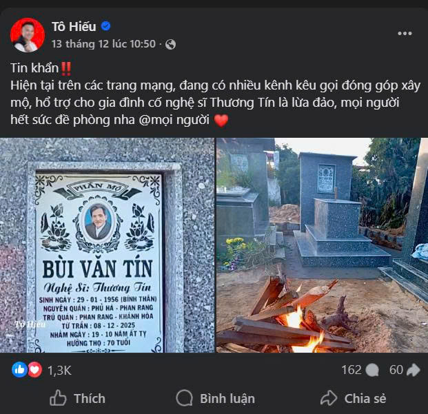 Trước đó, gia đình nghệ sĩ Thương Tín từng phải lên tiếng đính chính về việc kêu gọi tiền hỗ trợ xây mộ, lo hậu sự cho nam nghệ sĩ.