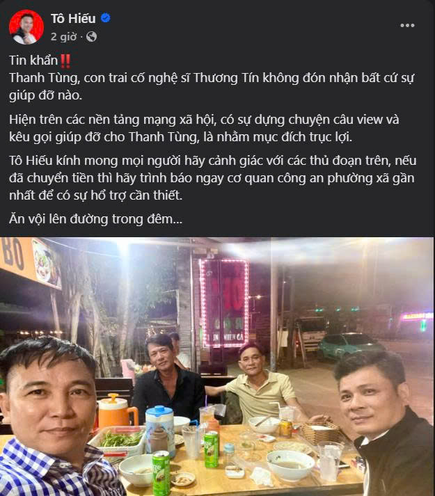 "Các clip trên mạng kêu gọi giúp đỡ Thanh Tùng đều là mục đích trục lợi. Con trai cố nghệ sĩ Thương Tín mong mọi người cảnh giác với các thủ đoạn nêu trên. Nếu ai đã chuyển tiền thì hãy trình báo ngay cơ quan công an gần nhất để có sự hỗ trợ cần thiết", Tô Hiếu chia sẻ.
