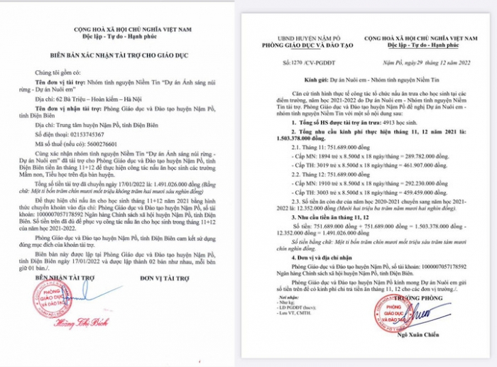 Hai tài liệu mới được cung cấp bao gồm biên bản xác nhận của Phòng GD&ĐT huyện Nậm Pồ về việc đã nhận đủ số tiền và công văn đề nghị hỗ trợ, được xem là căn cứ để thực hiện các giao dịch nêu trên.