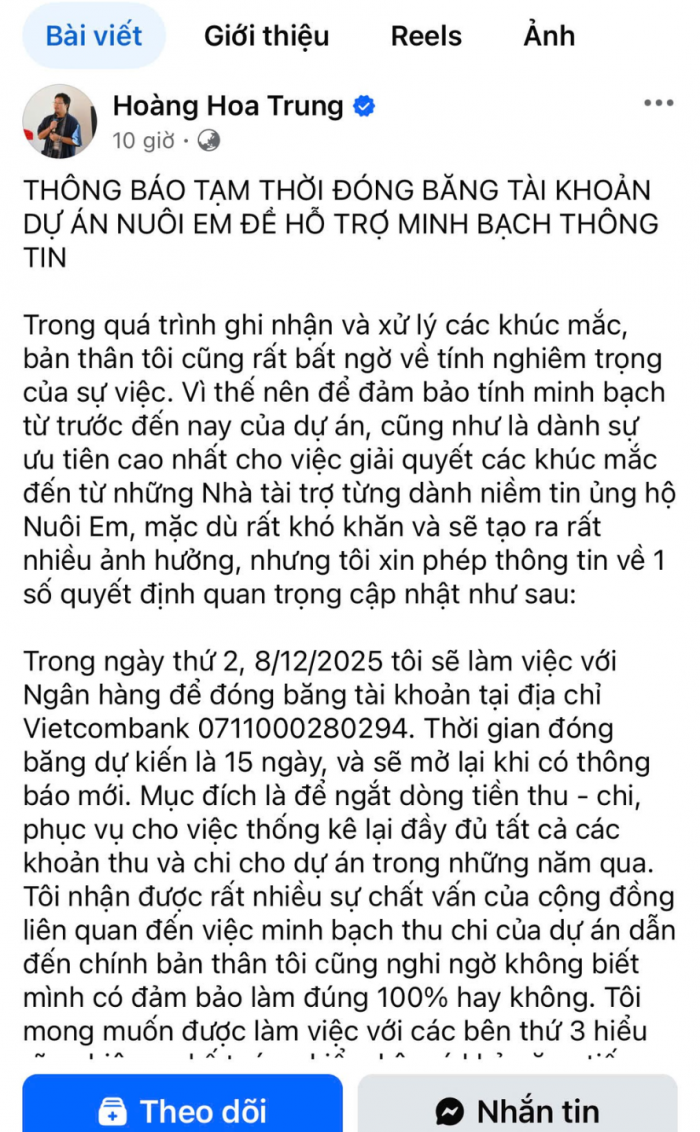 Tối 7/12, trên trang Facebook cá nhân, ông Trung bất ngờ thông báo tạm khóa tài khoản ngân hàng dùng để nhận hỗ trợ cho dự án Nuôi Em trong vòng 15 ngày.