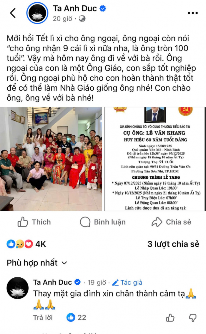 Trước đó, Anh Đức cũng đăng tải một bài viết thông báo ông ngoại của anh đã từ trần. Trong bài viết, anh chia sẻ ngắn gọn nhưng khiến dư luận không khỏi nghẹn ngào: