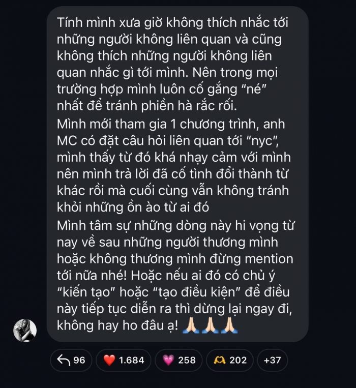 “Mình chia sẻ những dòng này mong từ nay về sau, những người thương mình hay không thương mình đừng mention (nhắc tới) tới nữa. Hoặc nếu ai đó có chủ ý ‘kiến tạo’ hay ‘tạo điều kiện’ để chuyện này tiếp tục thì dừng lại ngay đi, không hay ho đâu ạ.”