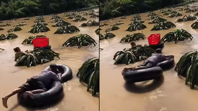 Trong đoạn clip được lan truyền, một người đàn ông phải bám chặt vào hai chiếc lốp ô tô, cố gắng bơi vào vườn thanh long để mót những trái cuối cùng còn sót lại. Cạnh đó, một người đàn ông khác cũng đang ngâm mình trong dòng nước lạnh pha bùn đất, dùng chiếc phao đặt rổ lên trên để thu hoạch nốt số thanh long chưa bị cuốn trôi.