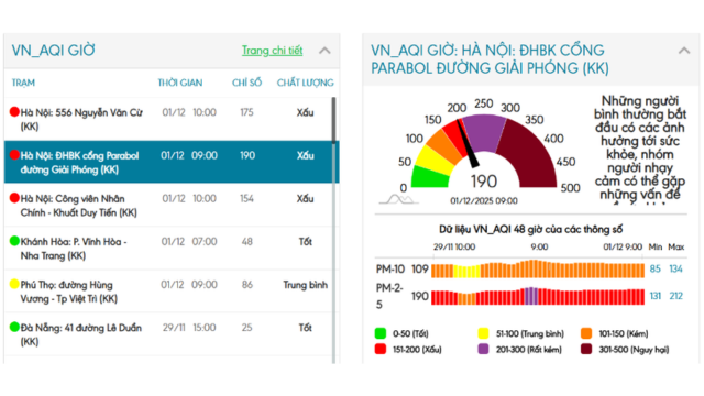 Đến 10h sáng cùng ngày, chỉ số AQI tại các trạm trên lần lượt là 175 (Nguyễn Văn Cừ), 190 (Đại học Bách Khoa) và 154 (Công viên Nhân Chính).