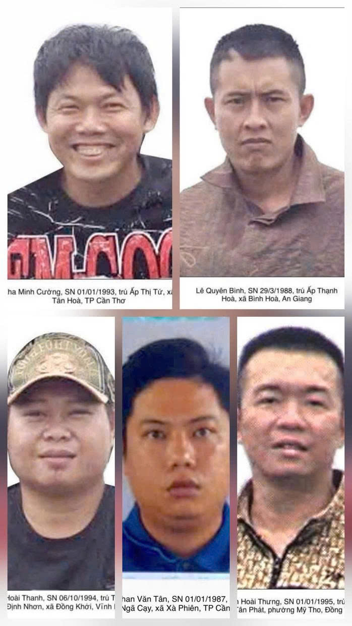 Bên cạnh đó, cảnh sát điều tra xác định có 5 đối tượng liên quan tới vụ việc, gồm: Kha Minh Cường (32 tuổi, trú tại thành phố Cần Thơ); Phạm Hoài Thưng (30 tuổi, trú tại tỉnh Đồng Tháp); Phan Văn Tân (38 tuổi, trú tại thành phố Cần Thơ); Lê Quyên Bình (37 tuổi, trú tại tỉnh An Giang) và Trần Hoài Thanh (31 tuổi, trú tại tỉnh Vĩnh Long).