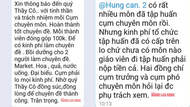 Tuy nhiên, nhiều giáo viên thuộc Cụm chuyên môn II đồng loạt phản ánh bị yêu cầu đóng 100.000 đồng/người để “bồi dưỡng” cho hai giáo viên thực hiện tiết dạy minh họa là cô T.T.TH. (THCS Quảng Thọ) và thầy Đ.P.H. (THCS Nguyễn Hàm Ninh). Khoản thu này được thông báo qua nhóm Zalo của Cụm với lý do hỗ trợ công tác soạn và minh hoạ bài giảng.