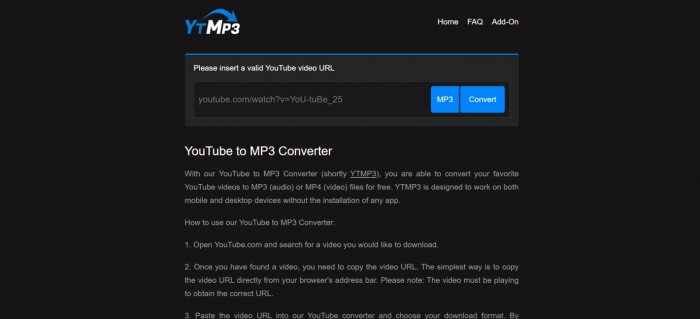 YTMP3 là một công cụ chuyển đổi bài hát YouTube sang MP3 trực tuyến đơn giản, cho phép người dùng nhanh chóng chuyển đổi và tải xuống các bản nhạc âm thanh từ YouTube. Ứng dụng hỗ trợ cả MP3 cho âm thanh và MP4 cho video, mang lại chất lượng đầu ra cao mà không cần cài đặt phần mềm. YTMP3 hoạt động trên mọi trình duyệt và đặc biệt hữu ích để nhanh chóng lưu nhạc ngoại tuyến.