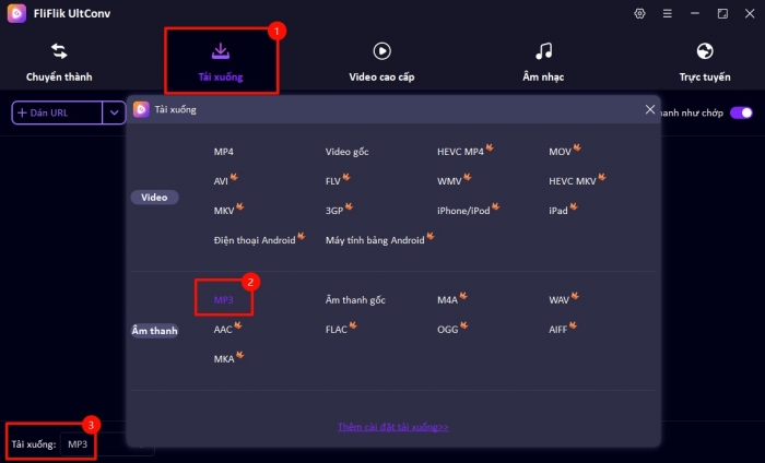 Bước 1: Mở UltConv YouTube Converter và chuyển đến tab Tải xuống. Nhấp vào nút "Tải xuống" ở cuối để chọn định dạng mong muốn (ví dụ: MP3).