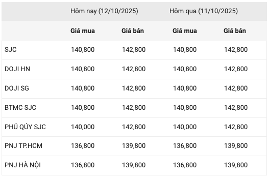 Theo đó, giá vàng miếng SJC tại Công ty VBĐQ Sài Gòn SJC niêm yết ở mức 140,8 - 142,8 triệu đồng/lượng (mua vào và bán ra), giữ nguyên so với phiên sáng. Chênh lệch mua bán vẫn ở mức 2 triệu đồng/lượng. Tập đoàn DOJI và Bảo Tín Minh Châu cũng niêm yết cùng mức giá này, cho thấy sự ổn định tạm thời sau chuỗi ngày tăng “nóng”.