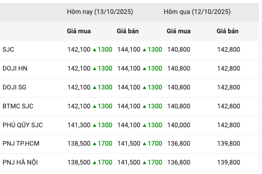 Khảo sát của Techz lúc 16 giờ cho thấy, tại Công ty VBĐQ Sài Gòn (SJC), giá vàng SJC được niêm yết ở mức 142,1 - 144,1 triệu đồng/lượng (mua vào - bán ra), tăng 1,3 triệu đồng/lượng so với phiên giao dịch trước. Bảo Tín Minh Châu cũng công bố mức giá tương tự và ghi nhận chênh lệch mua – bán 2 triệu đồng/lượng.