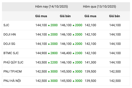Tại Bảo Tín Minh Châu, giá vàng miếng SJC cũng tăng mạnh, lên ngưỡng 144,9–146,9 triệu đồng/lượng, cao hơn 2,8 triệu đồng ở chiều mua vào và 2,3 triệu đồng ở chiều bán ra. Trong khi đó, Phú Quý Group điều chỉnh giá vàng miếng lên 144,1–146,4 triệu đồng/lượng, tăng 2 triệu đồng/lượng mỗi chiều.