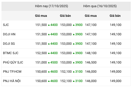 Tương tự, SJC, Bảo Tín Minh Châu, Phú Quý và VBĐQ SJC đồng loạt niêm yết quanh mốc 151 – 153 triệu đồng/lượng, biên độ tăng từ 3,9 – 4,5 triệu đồng/lượng. Đặc biệt, Bảo Tín Minh Châu ghi nhận giá mua vào tới 152,5 triệu đồng/lượng, tiệm cận ngưỡng “vàng quý tộc” của thế giới.