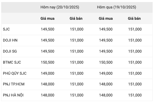 Cụ thể, tính đến 6 giờ sáng nay (20/10), Công ty Vàng bạc Đá quý Sài Gòn (SJC) niêm yết giá vàng miếng ở mức 149,5 - 151 triệu đồng/lượng (mua vào và bán ra). Mức giá này tiếp tục nằm trong ngưỡng giá cao nhất từ trước đến nay.