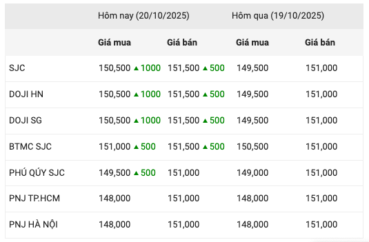 Tại Bảo Tín Minh Châu, giá vàng SJC đạt 151 - 151,5 triệu đồng/lượng, tăng 500.000 đồng/lượng ở cả hai chiều. Trong khi đó, Công ty VBĐQ SJC cũng niêm yết tương tự DOJI, với giá mua vào 150,5 triệu đồng/lượng và bán ra 151,5 triệu đồng/lượng.