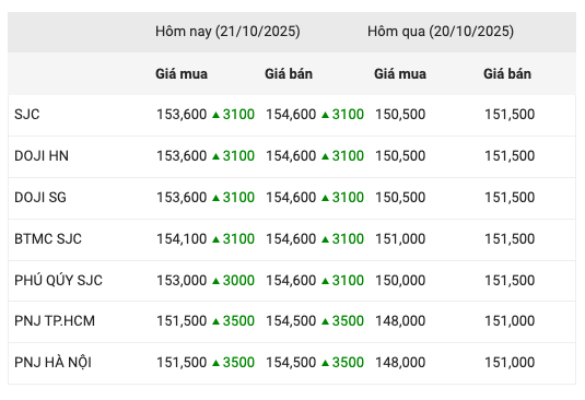 Tại Bảo Tín Minh Châu, giá vàng SJC cũng tăng mạnh lên 154,1 - 154,6 triệu đồng/lượng, cao hơn 3,1 triệu đồng/lượng so với hôm qua. Chênh lệch giữa hai chiều mua bán chỉ còn 500.000 đồng/lượng, phản ánh sức mua cực lớn trên thị trường. Trong khi đó, Tập đoàn Phú Quý công bố mức 153 - 154,6 triệu đồng/lượng, tăng 3 - 3,1 triệu đồng/lượng.
