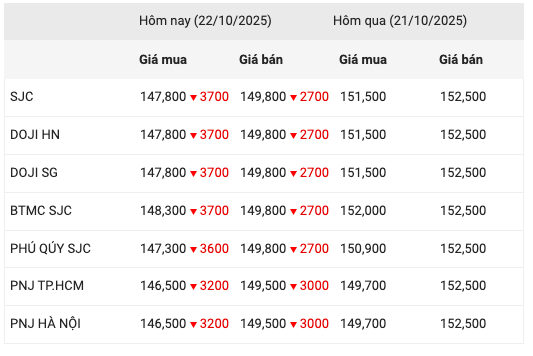 Theo khảo sát, giá vàng miếng SJC tại Tập đoàn DOJI hiện niêm yết ở mức 147,8 - 149,8 triệu đồng/lượng (mua vào và bán ra), giảm tới 3,7 triệu đồng ở chiều mua và 2,7 triệu đồng ở chiều bán. Công ty VBĐQ Sài Gòn (SJC) cũng ghi nhận mức tương tự, đưa giá mua bán về vùng 147,8 - 149,8 triệu đồng/lượng.