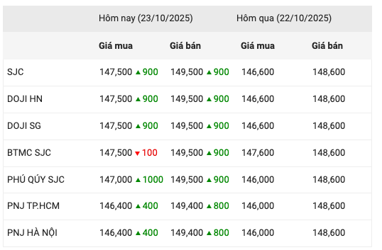 Khép lại phiên giao dịch ngày 23/10, giá vàng trong nước tiếp tục leo dốc mạnh, duy trì đà tăng ấn tượng khiến giới đầu tư lẫn người dân không khỏi ngỡ ngàng. Các doanh nghiệp lớn đồng loạt điều chỉnh bảng giá, đưa thị trường vàng lên ngưỡng chưa từng thấy kể từ đầu tháng.