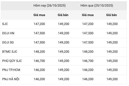 Tương tự, Bảo Tín Minh Châu cũng điều chỉnh giá vàng miếng xuống 148,2-149,2 triệu đồng/lượng, giảm cùng biên độ 2,3 triệu và 1,8 triệu đồng/lượng ở hai chiều. Chênh lệch mua-bán hiện chỉ còn 1 triệu đồng/lượng, phản ánh giao dịch trầm lắng do tâm lý thận trọng.