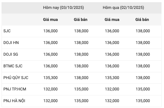 Tại Bảo Tín Minh Châu, giá vàng miếng cũng giữ nguyên vùng cao 136 – 138 triệu đồng/lượng. Trong khi đó, Phú Quý công bố giá mua vào 135,3 triệu đồng/lượng, bán ra 138 triệu đồng/lượng – tiệm cận mức cao nhất trong lịch sử.