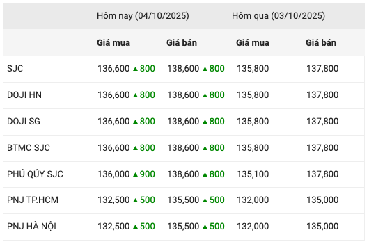Theo khảo sát vào tối 4/10, các doanh nghiệp vàng lớn đồng loạt điều chỉnh giá tăng mạnh ở cả hai chiều mua vào – bán ra. DOJI và Bảo Tín Minh Châu niêm yết ở mức 136,6 – 138,6 triệu đồng/lượng, tăng 800.000 đồng/lượng so với phiên trước. Phú Quý cũng nâng giá lên 136,6 – 138,6 triệu đồng/lượng, tăng 800.000 đồng/lượng ở chiều mua và 900.000 đồng/lượng ở chiều bán.