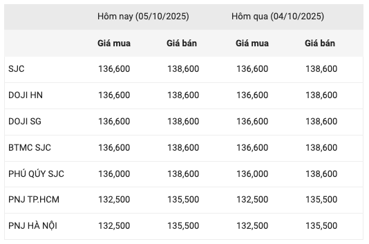 Theo cập nhật sáng 5/10, giá vàng trong nước tiếp tục tăng mạnh và giữ ở mức cao kỷ lục. Nhiều doanh nghiệp kim hoàn đồng loạt niêm yết vàng miếng SJC vượt ngưỡng 136,6 – 138,8 triệu đồng/lượng (mua vào – bán ra), đây được cho là mức giá cực kỳ cao trong thời gian gần đây.