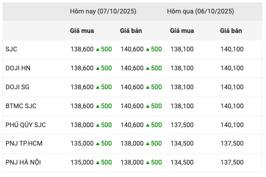 Giá vàng trong nước tiếp tục “bứt tốc” không phanh, chính thức vượt mốc 140 triệu đồng/lượng – ngưỡng được xem là “đỉnh kỷ lục lịch sử”. Ghi nhận trong chiều 7/10, các doanh nghiệp lớn như DOJI, Bảo Tín Minh Châu, Phú Quý đồng loạt điều chỉnh giá bán ra lên tới 140,6 triệu đồng/lượng, tăng tới 500.000 – 1.000.000 đồng/lượng chỉ trong nửa ngày. Mức tăng mạnh và nhanh khiến giới đầu tư “choáng váng”, nhiều người cho rằng giá có thể tiếp tục leo thang trong những ngày tới.