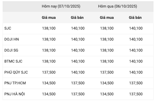 Thị trường vàng trong nước sáng 7/10 tiếp tục ghi nhận đà tăng mạnh. Cập nhật mới nhất cho thấy giá vàng miếng SJC và vàng nhẫn của các thương hiệu lớn đang giao dịch quanh ngưỡng 140 triệu đồng/lượng, khiến giới đầu tư choáng váng vì mức tăng 'phi mã' chỉ trong thời gian ngắn.