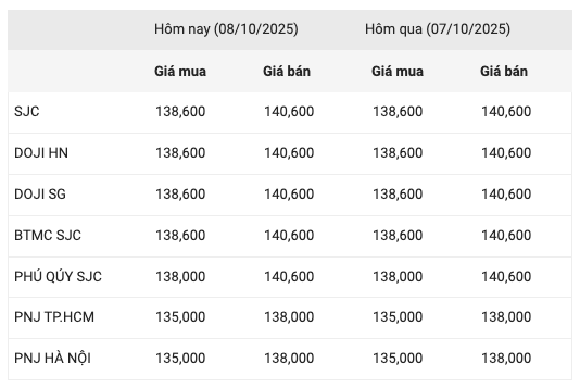 Giá vàng trong nước sáng nay (8/10) tiếp tục duy trì ở mức đỉnh cao kỷ lục, chưa có dấu hiệu hạ nhiệt dù đã trải qua nhiều phiên tăng mạnh liên tiếp. Theo khảo sát, giá vàng miếng SJC hiện vẫn neo quanh ngưỡng 140,6 triệu đồng/lượng, trong khi vàng nhẫn dao động khoảng 138 triệu đồng/lượng – mức giá khiến thị trường gần như “nóng rực”. So với đầu tháng 9, mỗi lượng vàng hiện đã tăng thêm hơn 10 triệu đồng, đưa kim loại quý này trở thành kênh đầu tư sinh lời vượt trội trong bối cảnh thị trường tài chính nhiều biến động.