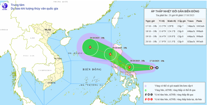 Theo dự báo, đến 19h ngày 17-10, tâm áp thấp nhiệt đới có sức gió mạnh cấp 7 (50-61 km/h), giật cấp 9. Trong 24-48 giờ tiếp theo, áp thấp nhiệt đới di chuyển theo hướng tây tây bắc, đi qua miền Trung Philippines. Đến tối 19-10, hệ thống này nhiều khả năng sẽ đi vào Biển Đông và mạnh lên thành bão. Khi đó, vùng biển phía đông bắc Biển Đông sẽ có gió mạnh cấp 6-7, khu vực gần tâm bão cấp 8, giật cấp 10; sóng biển cao từ 2,5-4,5m, biển động mạnh. Giai đoạn từ 20 đến 22-10, khu vực Bắc Biển Đông (bao gồm quần đảo Hoàng Sa) có thể xuất hiện gió mạnh cấp 9-11, giật tới cấp 14, gây nguy hiểm cho tàu thuyền hoạt động trong khu vực.