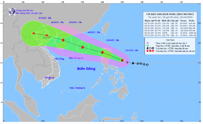 Theo Trung tâm Dự báo Khí tượng Thủy văn Quốc gia, đêm 3/10, bão Matmo sẽ đi vào Biển Đông và trở thành cơn bão số 11 trong năm 2025. Dự báo bão sẽ mạnh lên, có thể giật tới cấp 15 trước khi tiến vào khu vực Vịnh Bắc Bộ.