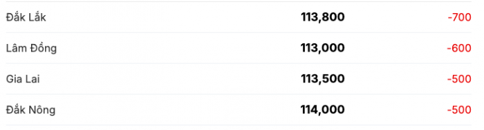 Cụ thể, Đắk Lắk giảm 700 đồng/kg xuống 113.800 đồng/kg; Lâm Đồng giảm mạnh nhất tới 600 đồng/kg, còn 113.000 đồng/kg; Gia Lai giảm 500 đồng/kg còn 113.500 đồng/kg, và Đắk Nông (cũ) cũng giảm tương tự, giá giảm 500 đồng/kg xuống còn 114.000 đồng/kg.