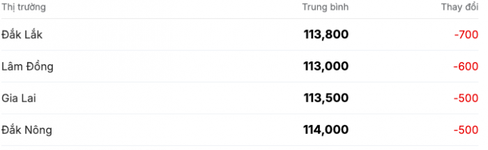 Cụ thể, giá cà phê tại các tỉnh khu vực Tây Nguyên sau khi giảm 500 đồng/kg trong ngày 10/10, đến cuối ngày 11/10 tiếp tục mất thêm 500-700 đồng/kg. Hiện giá cà phê khu vực này đang dao động quanh mức 113.000 – 114.000 đồng/kg, với giá trung bình đạt 113.800 đồng/kg.