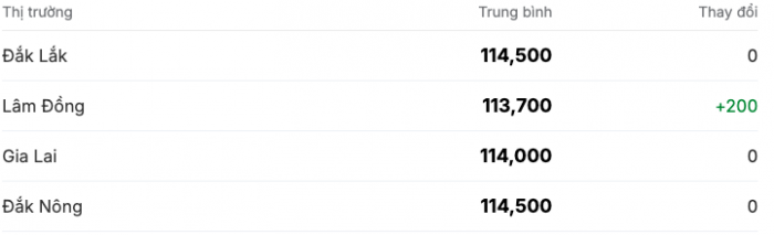 Cụ thể, tại Lâm Đồng, các khu vực Di Linh, Bảo Lộc và Lâm Hà đang được giao dịch cùng mức 113.700 đồng/kg. Ở Đắk Lắk, khu vực Cư M’gar hôm nay ghi nhận mức cao nhất là 114.500 đồng/kg, trong khi Ea H’leo và Buôn Hồ giữ mức 114.400 đồng/kg.